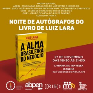 Um dos nomes mais influentes da publicidade brasileira, Luiz Lara lança o livro A alma brasileira do negócio – Da era de ouro à era digital, como a comunicação transforma o mundo (Matrix Editora), nesta quinta-feira (27), a partir das 18h30, na Livraria da Travessa de Ipanema, no Rio de Janeiro.